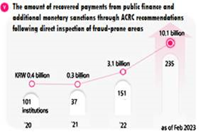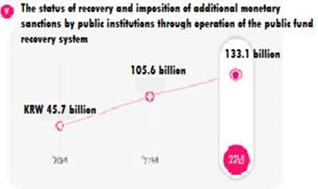 In addition, the Commission has been putting various efforts into eradicating subsidy frauds through stable implementation of the public fund recovery system, including distribution of promotional video and brochure to inform the general public of the system, fact-finding inspection of the status of recovery of payments from public finance by public institutions of various levels, and offering recommendations to public institutions found to have failed in administrating appropriate disposition of recovery and additional monetary sanctions.