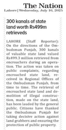 In a high-impact intervention, the Ombudsman Punjab oversaw the retrieval of 300 kanals of state land, valued at over Rs. 499 million, from illegal occupants across various districts.