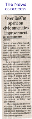 OMBUDSMAN PUNJAB FACILITATES RESTORATION AND IMPROVEMENT OF CIVIC AMENITIES.