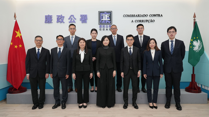 The Commissioner Against Corruption, Ao Ieong Seong, welcomed a delegation from the Department of Justice led by the Director of Public Prosecutions of the Hong Kong SAR, Yang Mei Kei, at the integrity education base of the Branch Office in Taipa of the CCAC this afternoon (11th February).